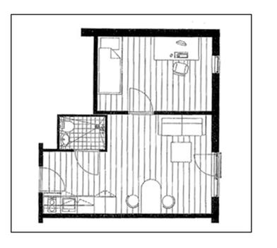 2-rums bolig med eget bad/toilet, trinettekøkken og fælleskøkken/rum på samme etage. Boligtype: TYPE 11, Boligareal: 48 (36)m2